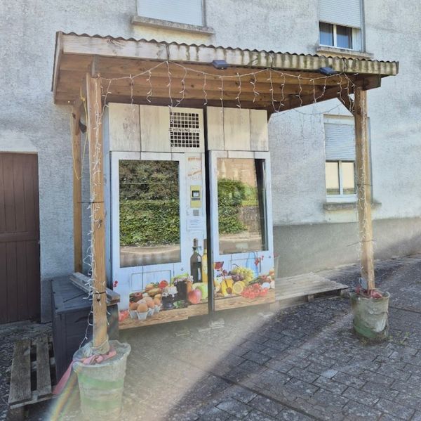 Selbstbedienungsautomat in Elvange, Schengen mit regionalen Produkten vom Bauernhof Froumillen, 24/7 geöffnet.