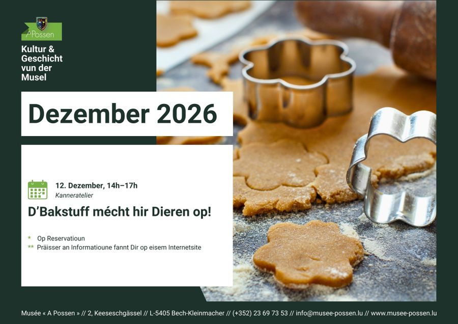 Anmeldung erforderlich per Telefon unter +352 23 69 73 53 oder per E-Mail an info@musee-possen.lu