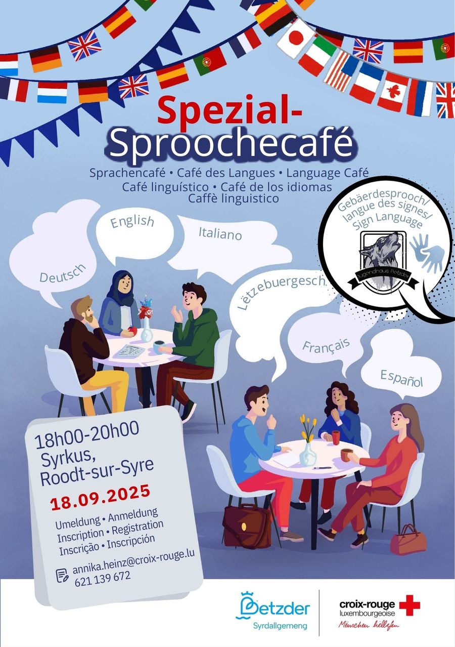 - verschiedene Tische mit verschiedenen Sprachen (deutsch, französisch, luxemburgisch, italienisch, spanisch, englisch usw.) .
