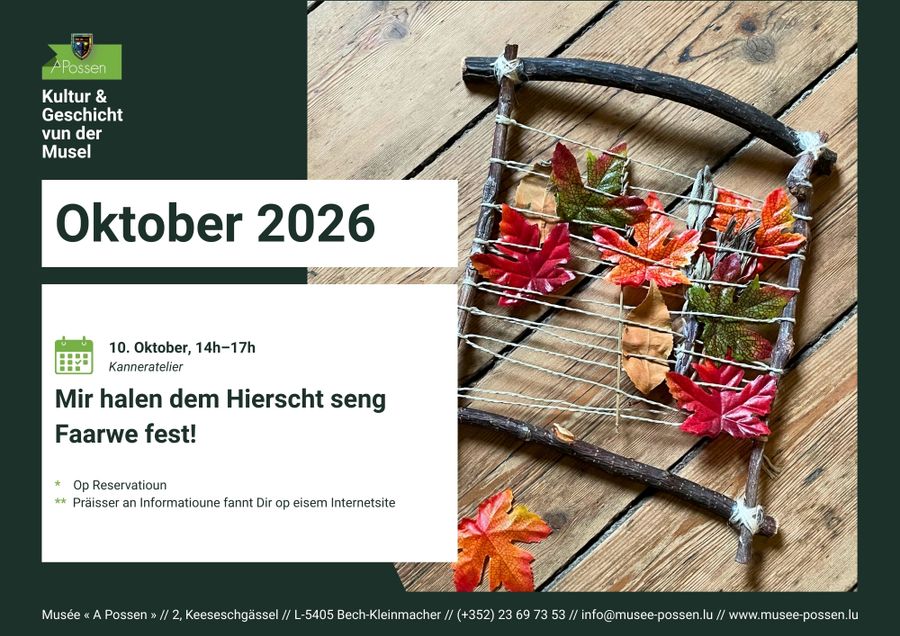 Reservation required by phone at +352 23 69 73 53 or by email at info@musee-possen.lu