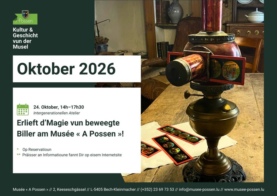 Reservation required by phone at +352 23 69 73 53 or via e-mail at info@musee-possen.lu