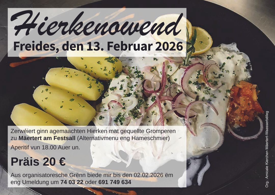 The Amicale Kierchen Mertert-Wasserbillig asbl serves herring with potatoes, alternatively ham sandwich.