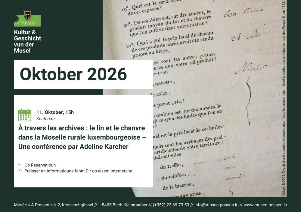 Based on historical documents from various archival collections of the Moselle region, Adeline Karcher will shed light, on October 11 at 3 p.m., on the role and importance of two key crops – flax and hemp – in the rural economy of the Luxembourg Moselle area. She will place them within the context of the daily work and living routines of the population at that time.
