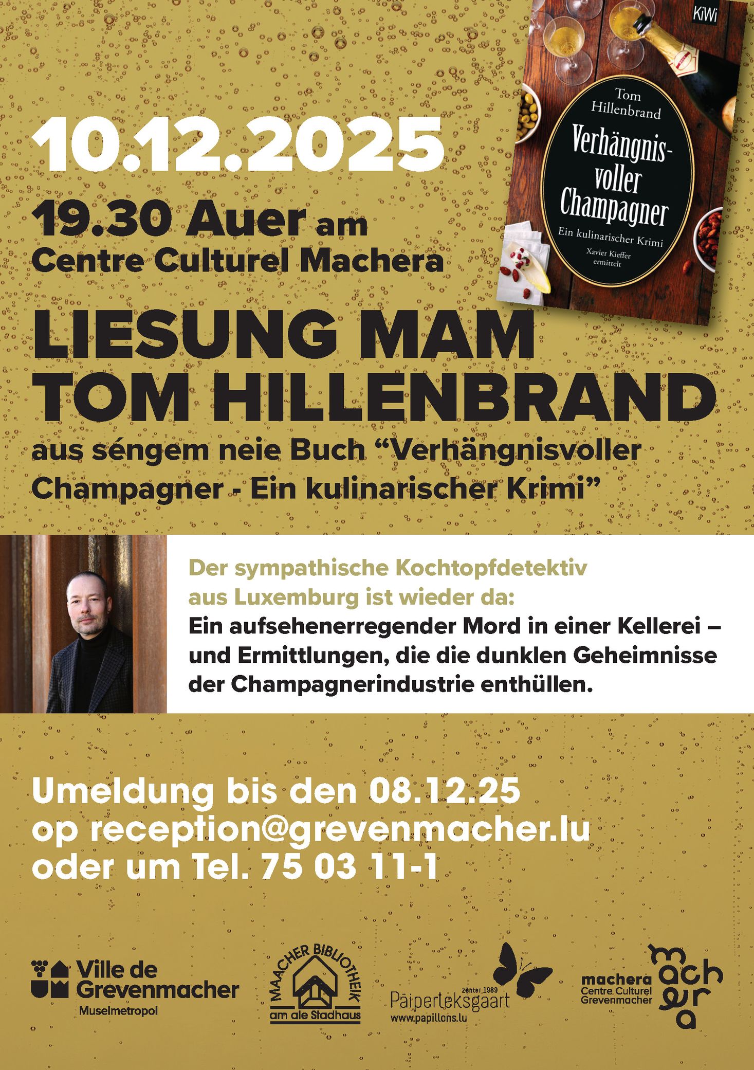 Quand ? Mercredi 10.12.202519:30 - 22:00 Conférence avec Tom Hillenbrand Où ? 3, Place du Marché aux Bestiaux, L-6731 Grevenmacher Art, culture & littérature Conférence avec Tom HillenbrandConférence du nouveau livre de l'écrivain Tom Hillenbrand... © echo.luDates des prochains événementsMercredi 10.12.202519:30 - 22:00