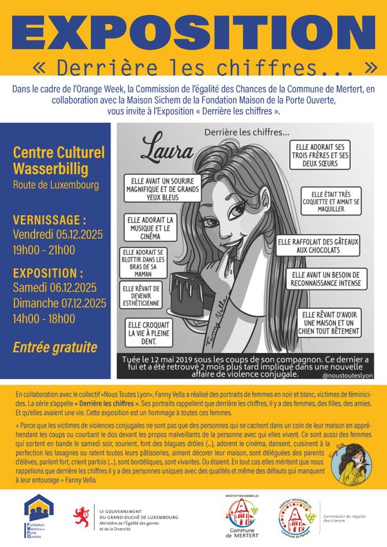 Dans le cadre de l’Orange Week, la Commission de l‘égalité des Chances de la Commune de Mertert, en collaboration avec la Maison Sichem de la Fondation Maison de la Porte Ouverte, vous invite à l’Exposition « Derrière les chiffres ».