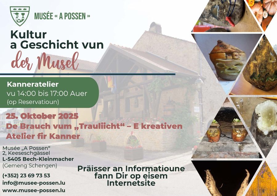 C'est une tradition ! Cette année encore, le Musée « A Possen » célèbre le coutume du « Trauliicht ». Le samedi 25 octobre, les enfants âgés de 6 à 12 ans auront l'occasion de participer activement à cette tradition fascinante. Avec l’aide de notre médiatrice, les jeunes participants apprendront étape par étape comment transformer une betterave en un « Trauliicht ». Au début de l'atelier, la betterave est vidé, puis les enfants créent et sculptent une grimace effrayante qui donnera vie à leur « Trauliicht ». À la fin de cet après-midi créatif, chaque enfant repartira fièrement avec son propre « Trauliicht » – une véritable œuvre d'art qui se voudra effrayante ! Ce moment sera agrémenté d’une petite pause gourmande : les restes de légumes seront transformés en une délicieuse soupe qui redonnera de l'énergie aux jeunes participants après leur effort de création. Et bien sûr, tous les petits visiteurs sont invités à se déguiser pour cette occasion spéciale ! Un après-midi passionnant et créatif, rempli de plaisir, de travaux manuels et de délicieuses gourmandises.