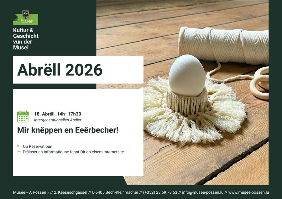 Réservation obligatoire par téléphone au +352 23 69 73 53 ou par e-mail à info@musee-possen.lu