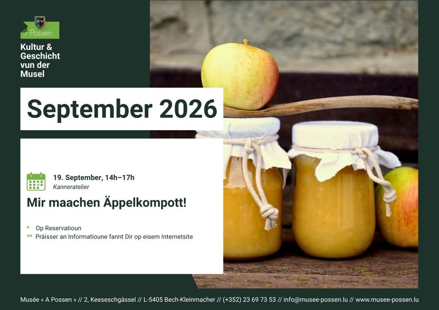 Réservation obligatoire par téléphone au +352 23 69 73 53 ou par email à info@musee-possen.lu
