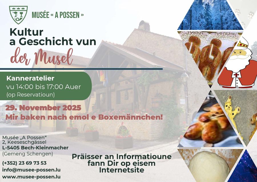 Le 29 novembre, les enfants âgés de 6 à 12 ans auront la possibilité de préparer leurs propres « Boxemännchen » dans le cadre d'un atelier créatif. Avec l’aide de notre médiatrice, une pâte à base de fromage blanc sera préparée, étalée, et les bonhommes seront découpés dans leur forme caractéristique. Chaque enfant pourra décorer son « Boxemännchen » avec des raisins secs et une petite pipe en argile. Après la cuisson, les œuvres finies seront emballées dans un sachet décoré avec soin, que les enfants pourront emporter chez eux. Un après-midi créatif rempli de plaisir et de délicieuses pâtisseries !