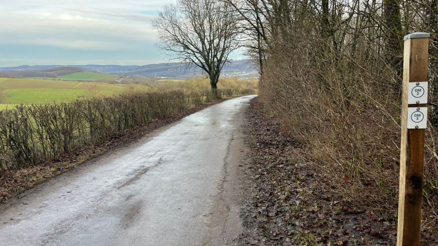 Le sentier local mène depuis la gare routière au point de vue « Gruussfooscht », puis traverse la forêt vers « Haard ». Après l’autoroute A1, il passe par les vignobles jusqu’à la rue Boland et revient au centre.