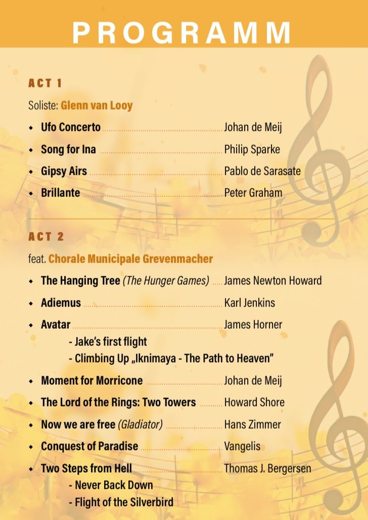 Mat der Chorale Municipale va Gréiwemaacher mat hire 40 Sängerinnen a Sänger présentéiere mer Eech bekannte Melodien wi The Hanging Tree, At Wit's End a Remember vam Hans Zimmer, Adiemus, Flight of the Silverbird, Climbing UP "Iknimaya-The Path to Heaven an Jake's first Flight vam James Horner allen 2 aus dem Film Avatar a Never Back Down-Two steps from Hell (Battle Cry). Conquest of Paradise (Vangelis) an Moment for Morricone duarrefen hei o net feelen.