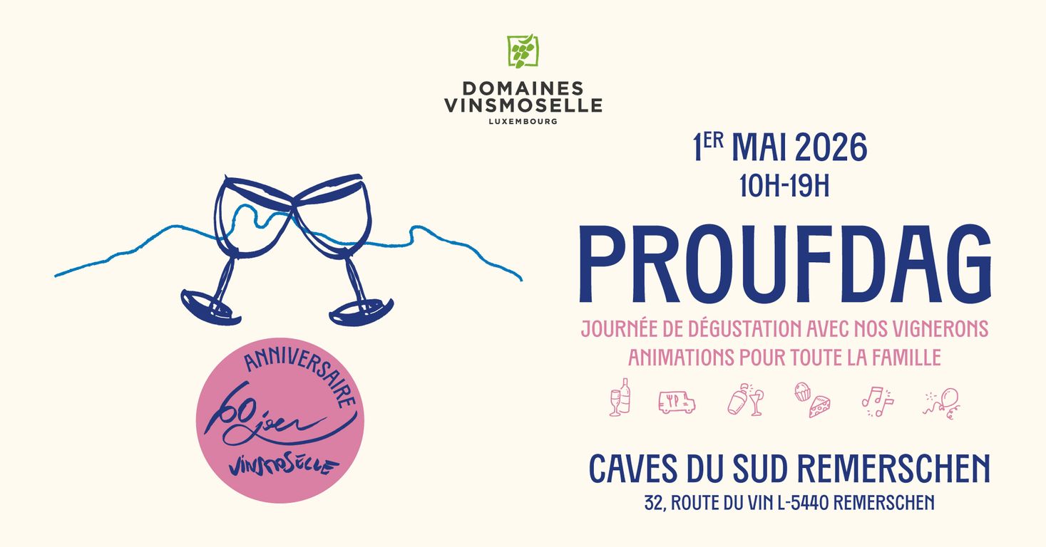 Join us for our traditional “Proufdag” tasting day on May 1st in our cellars in Remerschen. On this special occasion, Domaines Vinsmoselle will celebrate its 60th anniversary in partnership with Luxembourgish artist Jacques Schneider.