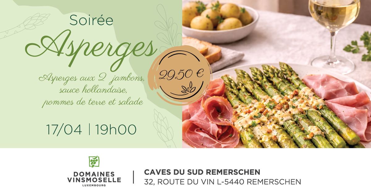 On the menu: asparagus with two types of ham, Hollandaise sauce, potatoes and salad, complemented by a fine selection of our wines & Crémants. (non-alcoholic options are also available).