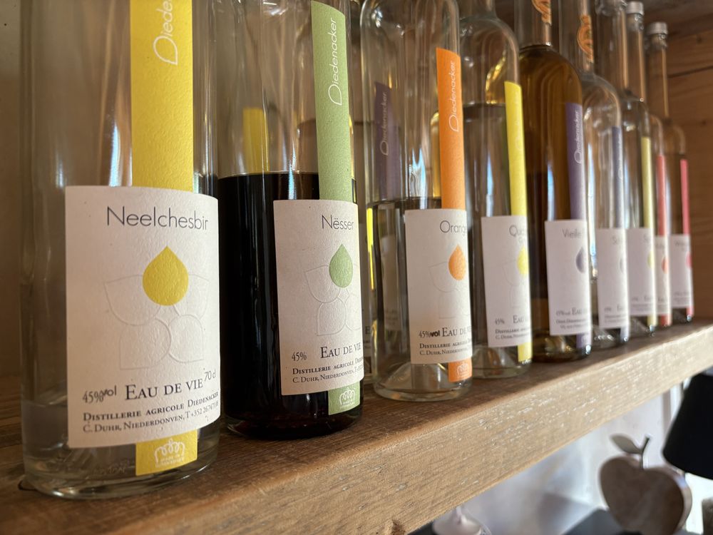In 1837, Johannes Kass and Barabara Fischer founded a small family business in the "Diedenacker" corridor where the winery and distillery are located today. The distillery, in a smaller form, has existed since 1862 as documented by an old customs receipt. At that time the wine was produced exclusively for sale and the "wine" made from apples (Viz) and pears was used for private purposes. Today the house is in the hands of the sixth generation. In 2000, the sons of the previous owner, Nicolas Duhr, took over the business. Since tradition cannot flourish without innovation, the sons decided in 2010 to separate the business and to concentrate more on what they had learned. As the agriculture harmonises very well with the distillery, Camille and Mariette decided to concentrate on distilling, but this does not limit the sale of the wine and crémant of the neighbouring house. The main source of income of the agricultural branch is the milk production, with a great herd, including 35 dairy cows of the Holstein breed. The barn and most of the pastures are located directly behind the home house. On the 35 ha of pasture land there are also the high-stem fruit trees dedicated to the production of most of our brandies and liqueurs. Distillery Diedenacker, the first whisky distillery in Luxembourg. Production of exquisite brandies and liqueurs from local and regional fruit. Tastings on request.